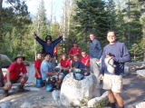 午後2時を過ぎ、下ってくるハイカーが多くなるっすれ違うたびに「いいキャンプサイトが上にあるかい?」と聞く。「いいところがあるよ、樹林帯の端に涼しそうなのがいくつもある」と皆が言うので、そこにキャンプすることにする。184マイル地点。それとわかるところにやってきたので、早速テントを張り、水を汲みに上流へ行くと、広くなったメドウのようなところで、若者たちがくつろいでいる。 「ここでキャンプかい?」と聞くと、「そうしたいけど、誰かがまだ登るんだって…」とリーダーらしき青年に皆の視線が集まっている。 私は腫れたアキレス腱を冷やしながら、上って行く彼らを見てた。制服の団体が降りてくる。もう生水は平気になっていて、水を飲んでいると、今度はつるはしを背負った制服の団体が降りてくる。トレイルを整備している人たちが、仕事を終えて、キャンプに帰ってゆくところだった。 テント場に帰ってみると、何組かテントを張っていた。向かいに立派なテントを張ってる夫婦に声をかけた。ご主人が「クールなテントだね、それ」と指さすので、いつものように「半ポンド以下だよ、ちょっと小さくて顔が出そうだけど」と答える。「半ポンドはすごい!」と感心される。つい胸を張ったりする自分がいる。サクラメントからのジャックさん夫婦。「今夜は素晴らしい天体ショーが見られるよ」と教えてくれた。流星雨なんだ。 隣のテントはアジア系。この谷の下部で見かけた二人連れらしい。めでたいお赤飯と味噌汁をいただいて、日記をつけていると、男性が話しかけてきた。台湾生まれだそうで、おばあさんは日本人だと言われた。年齢は私じ年。職業も昨年までの私と同じ、メインフレームのシステムエンジニア。富士通とIBMのシステムを開発してたというと、彼は長いことIBMのファームウェアの開発をやってたという。すっかり気があってしまって、もう夕食はすませたのに、ラーメンを御馳走になった。 天体ショーも見たかったが、なんとなく眠くていつもどおり7時半に寝た。