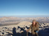 | 朝、3時。なんとなく目が覚めた。思ったほど寒くない。 マッチは昨日使い果たして、やっぱり残り少ないライターで何とかコンロに火をつけた。ライター自体を温めておけばまだ使えそうだ。テントも寝袋ももう使うことはない。空になったベアキャニスターに詰め込む。 クッカーもこれが最後。あれもこれももう最後。大きめのスタッフバッグに入れ、デポ用荷物を作った。 あと必要なのは・・・そう、お金を出せるようにしておかないといけない。 長いこと財布を見てないけど、あるんだろうか? ダウンのウェアを着たまま、最後のめでたいお赤飯を頂いた。お味噌汁も最後。おいしい。 4時過ぎ、ギター湖を後にする。月がとっても明るいから、ヘッドランプはいらない。 あれこれ思い出すんだろうか、と登りだした。が、けっこういい登りで、おまけに高度感も出てき、ついでに道幅もせまくなり、気を引き締めないと危ないかも・・・と、靴の紐を締めなおす。長い長いスイッチバックが続く。緊張感が、足の痛みを忘れさせてくれる。 5:30。狭いトレイルが広くなってちょっとした岩棚風のところに到着、トレイルクレストにたどり着いたことがわかった。ここでホイットニーポータルの方から上ってくるトレイルと合流する。ずいぶんと、長くいい(悪い)登りだったなぁと、ザックからデポ用のスタッフを取り出す。そこに、もう大きなクマ缶と荷物がデポしてある。 え?私より早い人がいる!驚いた。 ホイットニー山頂上までは2マイル。一時間もあれば着けるはず、そう思って先へ進む。鋸状の稜線のかなり下につけられた道は上りではなく平坦な道だ。大きな岩だらけの道は山稜の西側をずっと這っている。高度感があり、躓くと大変そうだ。夜明け前で気温がぐんぐん下がり、ときおり道に覗く土の部分は凍ってがちがちになっている。稜線の小窓から、朝陽が差し込んで、下のヒッチコック山を赤く照らし出している。夜が明けるのも早いものなんだ。そんな中にも咲いている花がある。たくましく、美しい、青い花。昨日のフォレスター峠にもあった。 三つの岩峰が見える、一番遠くの高い峰がホイットニー山だとわかると、ペースが上がる。雪と岩ばかりの稜線では踏み跡がところどころしか見えない。本峰にかかると、さすがに心臓が走りだした。体も重く、立ち止まりそうになる。ペースが落ち、風が強くなり、寒くなる。これはイカンと、ダウンのズボンを取り出し、岩陰で身につけると、一気に暖かくなった。なんとありがたい…そう思わずにおられない。小屋だ見えると道は消えてなだらかな岩だらけの斜面になった。 6:50.頂上小屋に到着。人が立っている。トレイルクレストにあった荷物の先客だった。その女性・カレンさんは、きのうの「ぴーぷー」娘さんだった。写真を撮り合って、長いジョンミューアトレイルの終わりを祝った。なぜか日本式バンザーイだった。 360度が見渡せる。西の海岸、都会のほうに雲がたなびいているほかは、快晴だ。サンタクルーズの山火事がまだ燃えているようだ。ビッグホーンプラトーもヒッチコック山もずいぶん下にある。 何度もぐるっと見渡し、しばらく二人で「う〜ん、う〜ん」と言うばかり。 カレンさんに尋ねると、彼女は昨日の夜10時に頂上に到着し、小屋で一泊したらしい。 「暗闇の2マイルはとっても危ないし、よく無事に着いたね、なぜそんな危ないことを?」と聞いた。 「昨日は私の36回目の誕生日だったからどうしても昨日のうちに上りたくて。それに私はトレッキングが仕事だから大丈夫なの」という。 「おお、おめでとう!、そう、では今夜は誕生パーティーをやろう!」 「私、ピザが食べたい!」 「じゃ、ピザファクトリーだ」 と、賑やかに下山をはじめた。 ジョン・ミューア・トレイルは終わった。 ここからはホイットニー・トレイルというのだろうか。 私の倍くらいの荷物を持ったカレンは、けっこう早いスピードで下山してゆく。私は上りが時速2マイル、下りが時速3マイル、平均で時速2.5マイル(4km)。こちらでもけっこう健脚になると思うけれど、カレンは私の倍の荷物なのに。彼女はアパラアチア山脈のトレイルで、トレイルウォークの講師をしているという。 2峰の雪渓でランナーに会った。見ているほうが寒い。時折、登山者に会う、ギター湖からの人たちだろう。 途中の岩棚に小さいザックが置いてある。 「このザック、来るときもあったけど、君の?」 「昨日、私が登るときもあったわ」 「誰か遭難?」 中を開ける。空のペットボトルと空のジップロック,etc…ゴミだった。誰かが重くなって、置いて行き、帰りに拾うのを忘れたのかも知れない。荷物の軽い私が背負って、トレイルクレストに戻った。 再び稜線に出ると、眼下にオーエンズバレーが広がっている。見降ろすと、ほぼ絶壁。スイッチバックが延々と続いて下っている。快晴のトレイルを何度も何度も折り返してゆく。 挨拶をするのが嫌になるくらい