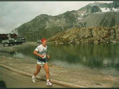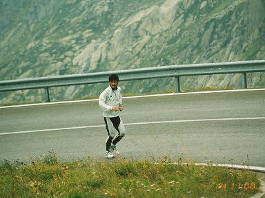 レ−ス最大の難所は二度のアルプス越え。8月の真夏の坂を延々と上りつづけます。最初の峠は霙が降り、二つ目の峠はBMWがブレ−キングテ ストに使用するNufnennPass。氷河を見ながら下って行く道は、ひたすら曲がりくねって、いつまで たっても終わらない気がしました。