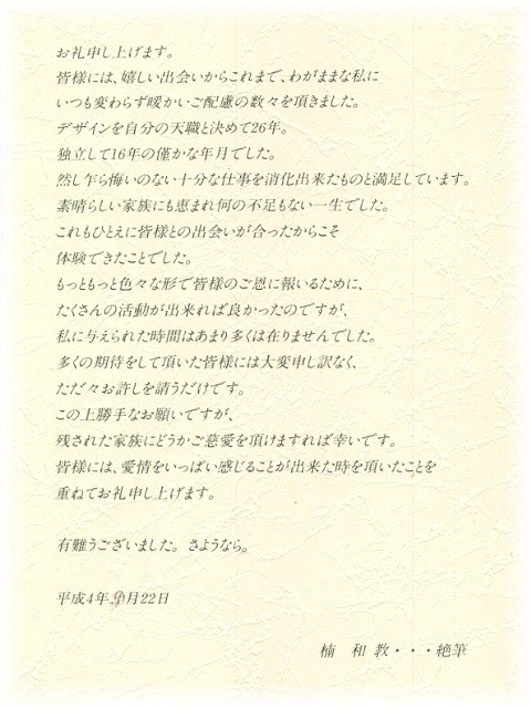 最初から「ガン」だと告知してもらってました。化学療法を受けていた彼を見舞った時「餞別あげる」とくれた手紙・・・私たちの宝物です。
